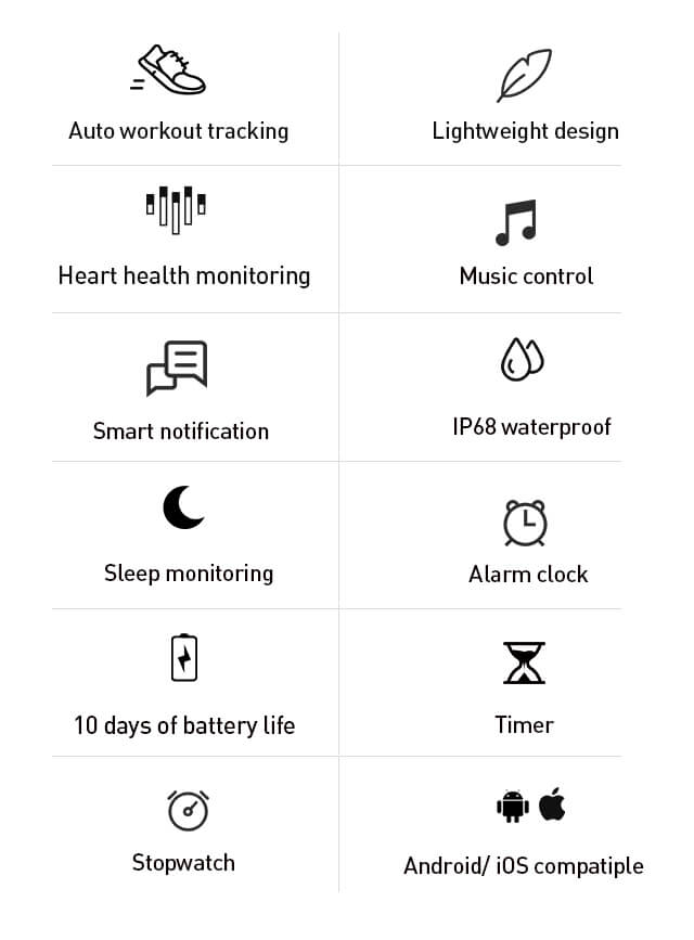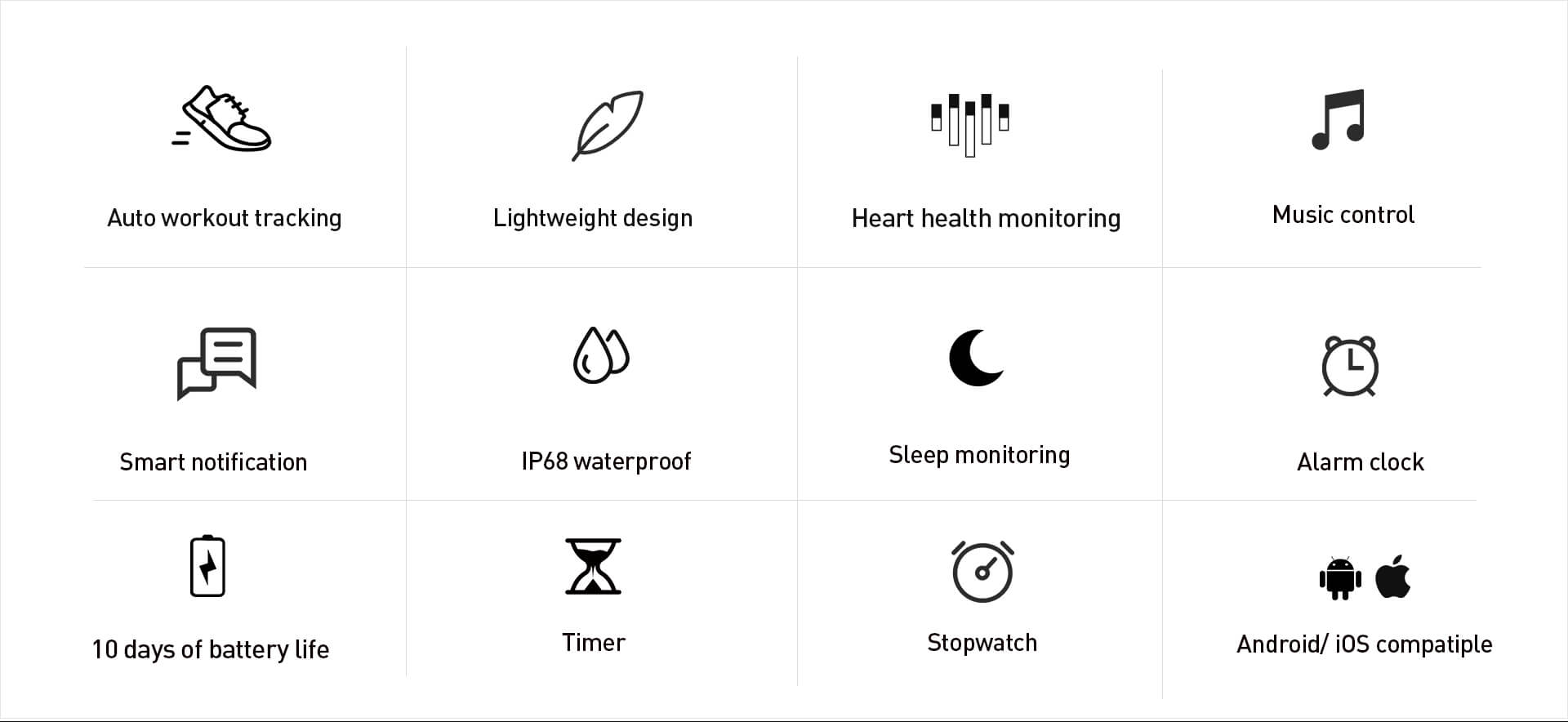 واسعة 1.69 بوصة شاشة واضحة لمساعدتك على الوصول إلى كافة القوائم والإشعارات. حافظ على صحتك من خلال مراقبة معدل ضربات القلب على مدار الساعة طوال أيام الأسبوع. مجهزة بالمعدات المتقدمة IP-68 تكنولوجيا مقاومة للماء. مفضل لجميع الأشخاص الذين يتنقلون كثيرًا لأنه يحتوي على بطارية احتياطية تصل إلى 7-10 أيام. حافظ على مراقبة نومك جيدًا باستخدام نظام النوم الحديث. تتبع جميع أنشطة اللياقة البدنية الخاصة بك مثل الخطوات والسعرات الحرارية والمزيد. 24 وضعًا رياضيًا فريدًا. اختر وجه ساعتك الأنيق مثلك. تنزيل "Glory Fit" برنامج لتحقيق جميع أهدافك الاستثنائية. ساعة Silver Smartwatch متوفرة فقط في الولايات المتحدة.