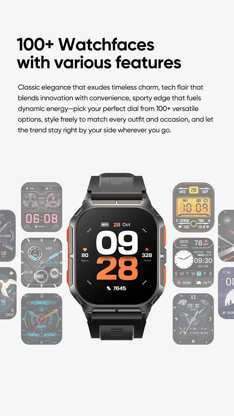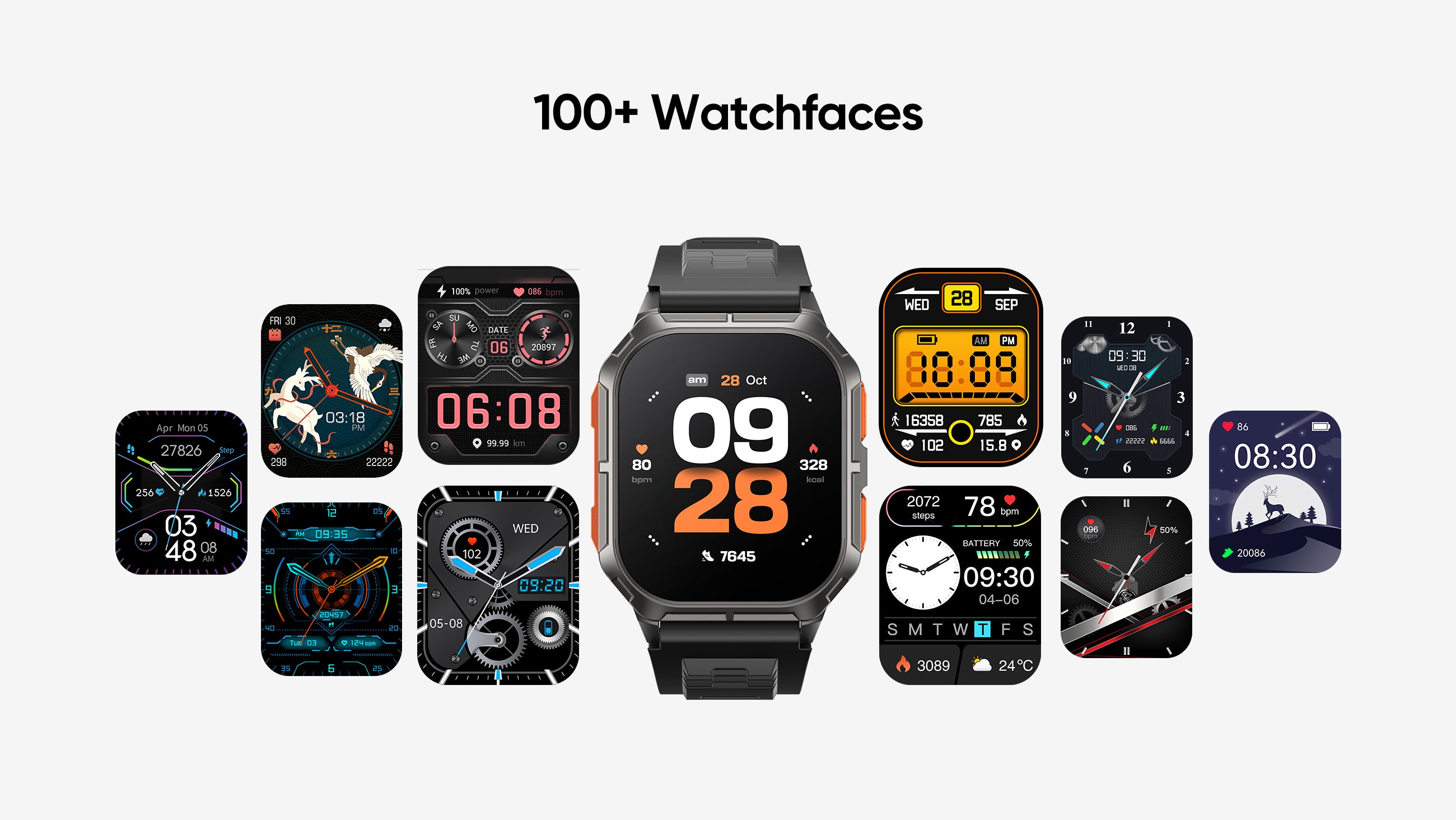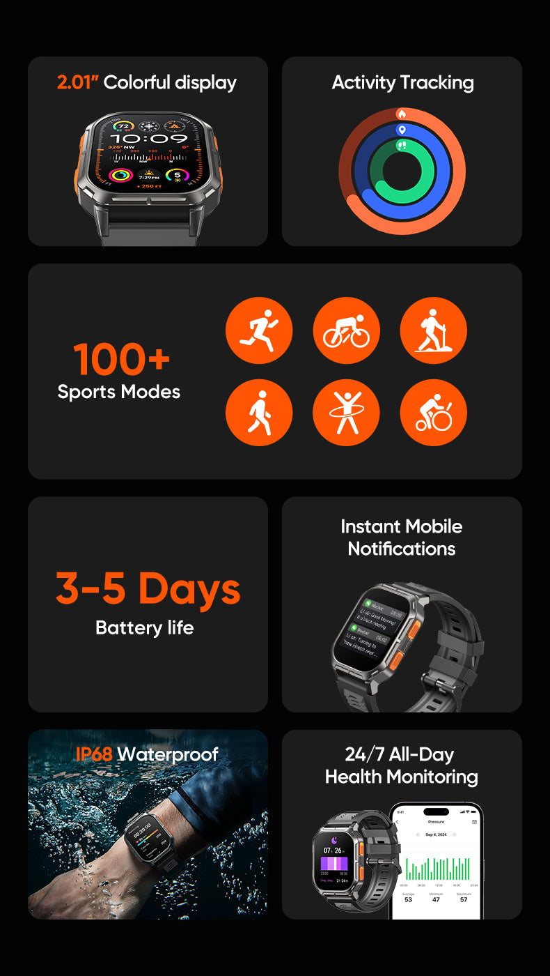 1.83-inch HD full-screen display with a 2.01-inch square screen and 240*296 resolution ensures bright, clear images from any angle. Supports over 100 exercise modes, including running, cycling, and swimming. Battery life lasts up to 5-7 days. Accurate and detailed sleep and nap tracking helps you manage your sleep patterns and improve your overall health. IP68 dust and water resistance. Gain insights into your health and fitness data with custom apps designed for intuitive navigation and rich information display. Raise your wrist to make Bluetooth calls, and remote camera control makes it easy to capture group photos. Choose from over 100 customizable watch faces for quick and easy switching. Accurately measures blood oxygen levels to help you understand your overall health.