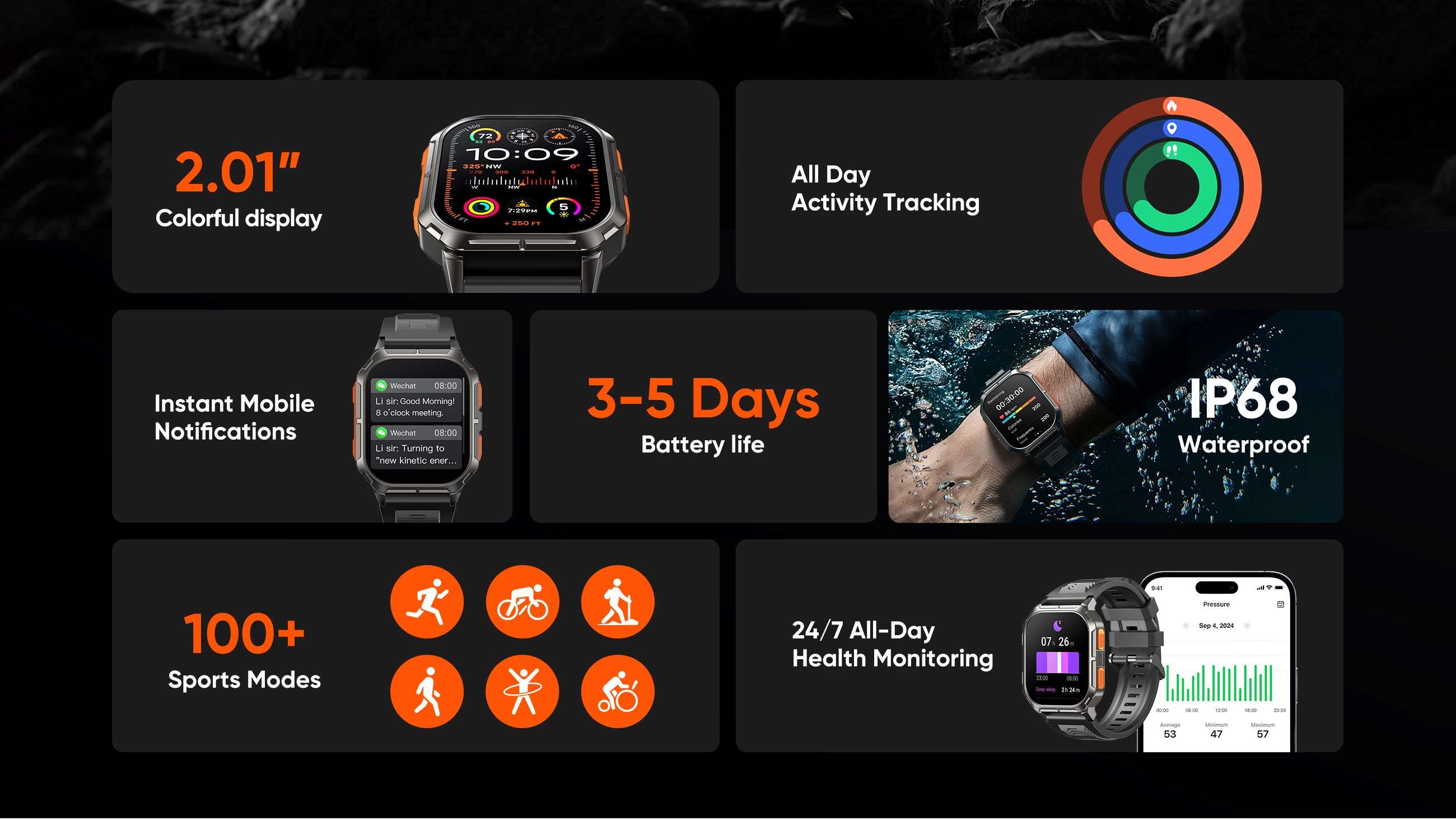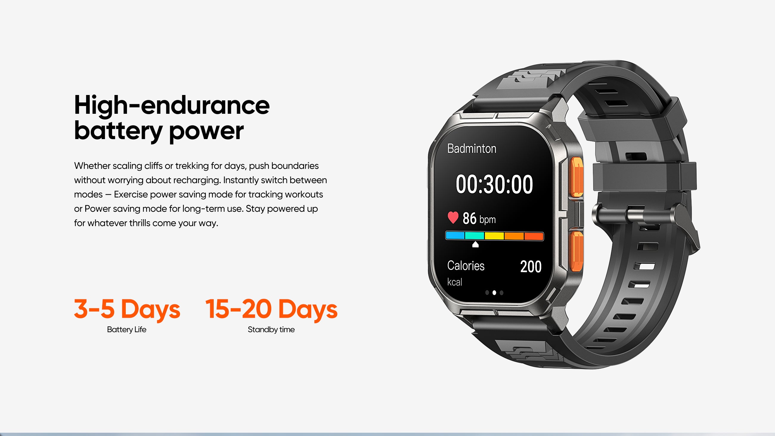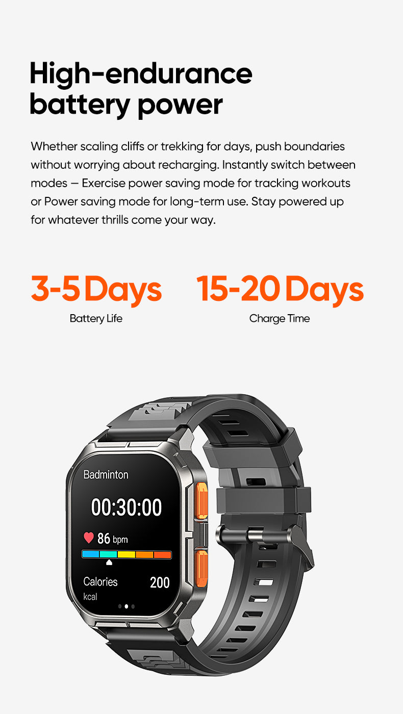 1.83-inch HD full-screen display with a 2.01-inch square screen and 240*296 resolution ensures bright, clear images from any angle. Supports over 100 exercise modes, including running, cycling, and swimming. Battery life lasts up to 5-7 days. Accurate and detailed sleep and nap tracking helps you manage your sleep patterns and improve your overall health. IP68 dust and water resistance. Gain insights into your health and fitness data with custom apps designed for intuitive navigation and rich information display. Raise your wrist to make Bluetooth calls, and remote camera control makes it easy to capture group photos. Choose from over 100 customizable watch faces for quick and easy switching. Accurately measures blood oxygen levels to help you understand your overall health.